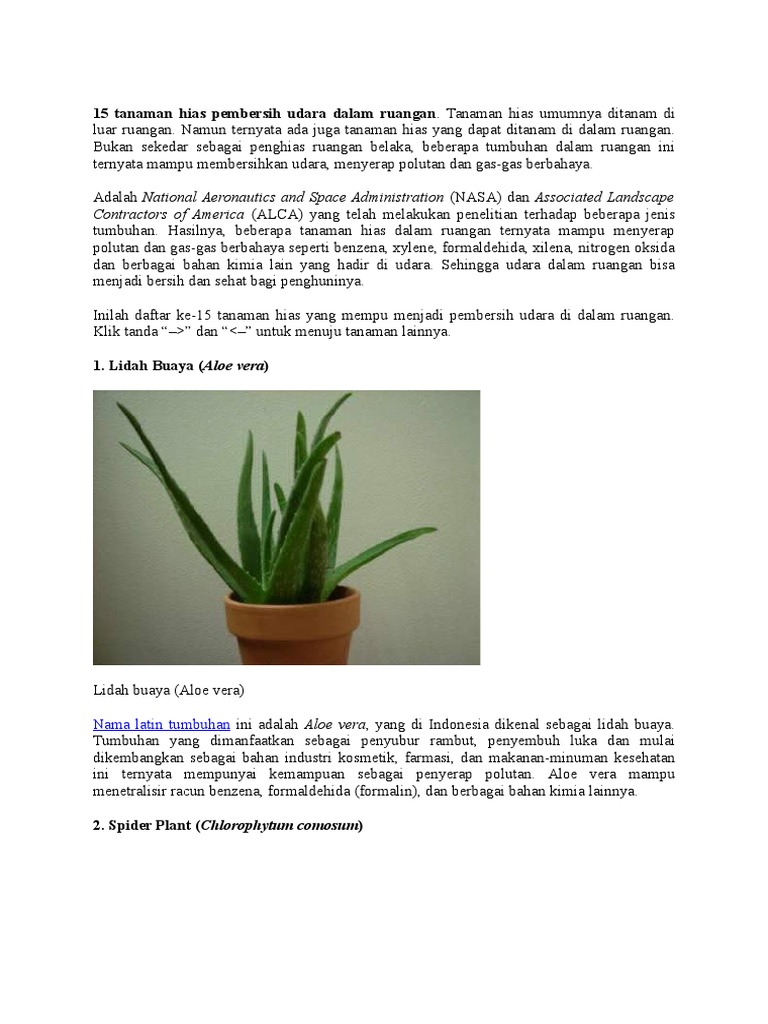 Selain efektif sebagai pembersih ruangan dan pengusir polutan, tanaman ini juga cenderung mudah dirawat. Dari begitu banyaknya tanaman hias untuk membuat udara dalam ruangan lebih bersih, berikut ini 5 tanaman diantaranya: Misalnya ada kabut asap atau lain sebagainya tanaman tersebut dengan otomatis memperbaiki udara dalam ruangan, ucapnya. Tanaman hias pembersih udara dalam ruangan ini di indonesia pun lebih sering dijadikan sebagai tanaman outdoor. Tanaman hias anti racun murah penghisap racun udara. Tanaman hias yang hakekatnya berfungsi untuk memperindah sebenarnya juga memiliki fungsi lain yaitu dapat menyehatkan udara, dan hal itu berdampak pada kesehatan tubuh. Pada 1989 lalu, nasa menemukan bahwa tanaman hias yang diletakkan di dalam rumah bisa menyerap racun dari udara. Hasil studi yang dilakukan nasa menunjukan bahwa udara di dalam ruangan tidak berarti bebas dari polutan yang berbahaya bagi tubuh. Tanaman hias sansevieria dianggap sangat efisien dalam memproduksi oksigen, termasuk di malam hari. Kemampuannya menyerap formaldehid, benzena, trichloroethylene, toluena, dan xilena yang banyak terdapat di udara dalam ruangan tidak lagi disangsikan. Berbagai tanaman pembersih udara yang sekaligus menjadi tanaman hias di rumah cukup efektif membuat udara rumah terasa segar. Tanaman hias yang berasal dari afrika dan kini tersebar ke segala penjuru dunia ini mempunyai tinggi mencapai 60 cm. Tanaman hias tidak hanya berguna untuk mempercantik rumah.